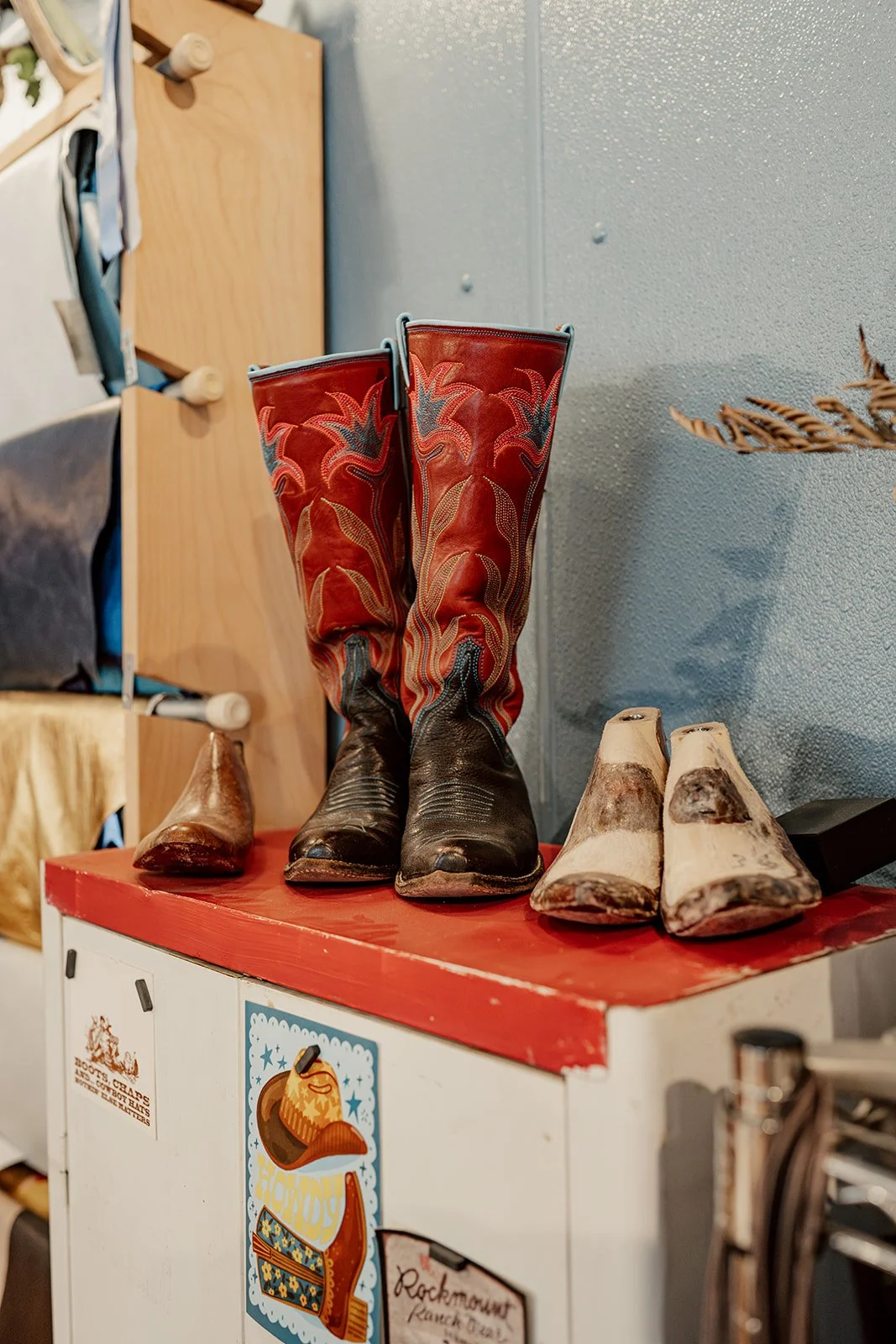 After accidentally meeting a boot maker at a party, she was introduced to the idiosyncratic world of custom cowboy boot makers. She sold her entire woodworking shop to fund the acquisition of all the boot making tools needed. After working with the leather for several years, she discovered its many attributes and potential and has now also taken the medium from the foot to the wall.